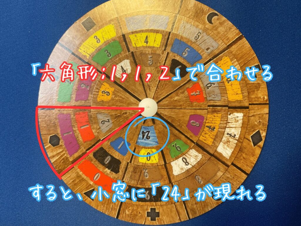 今回は「六角形の謎解き」から「1, 1, 2」という解答が得られました。そこでデコーダー〈暗号用円盤〉にこの数値を合わせると、小窓に“24”という数字が現れました。