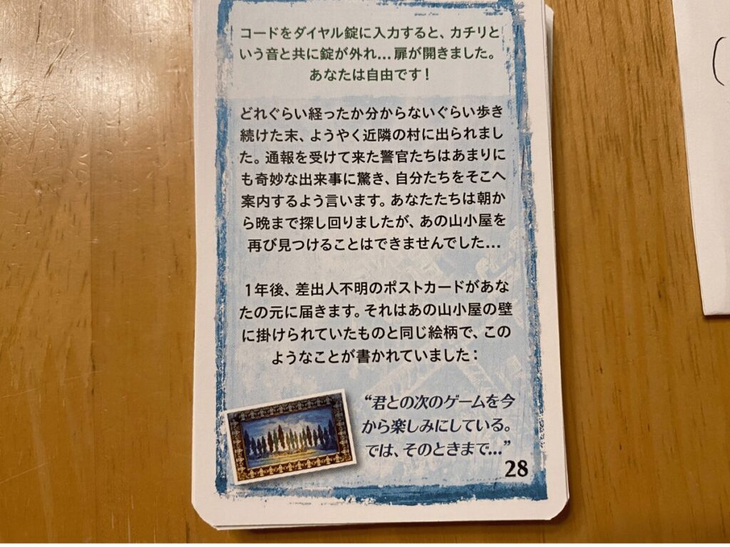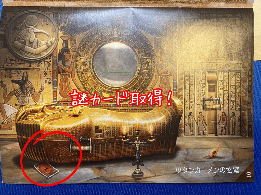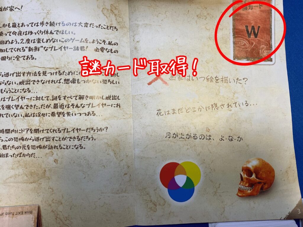 解答カード“1”を参照すると、新たな“謎カード”と“奇妙なパーツ”を入手できました。この流れを繰り返して謎解き明かし、“脱出”を目指します。