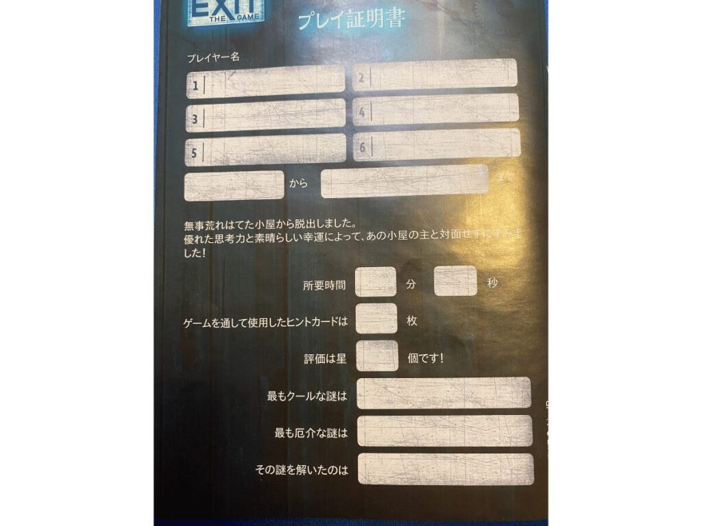 脱出に成功すると、クリアタイムおよびヒントカードの使用枚数に応じて最終評価が算出されます。そのため、プレイ開始と同時にストップウォッチを起動しておくと良いでしょう。