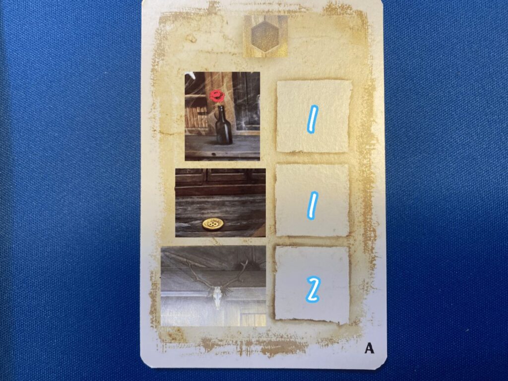 例えば、下記の場合では“本”には「閉じ込められた密室の状況」、“謎カード”には「六角形のマーク」と「花瓶/ボタン/剥製」が記載されているとします。ここで、密室の状況を確認すると、それぞれ花瓶は1個、ボタンは1個、剥製が2個あることが分かりますね。数を表しているとしたら、上から「1、1、2」が当てはまることになります。