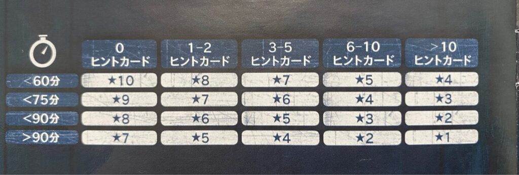 「実際のプレイ時間」と「ヒントカード使用数」から評価を算出してみましょう。