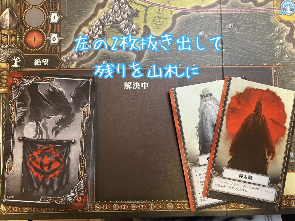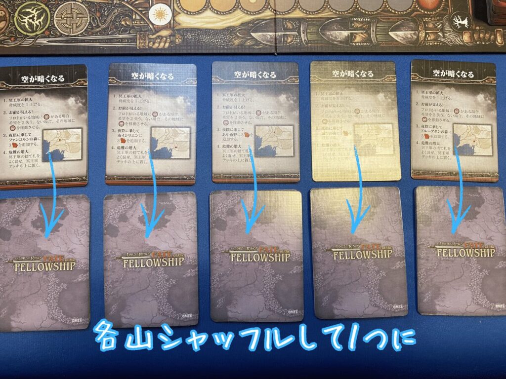 特殊冥王軍カード「陣太鼓」と「サルマンの車輪」を除く冥王軍カードをシャッフルし裏側でボード上に配置します。除いた特殊冥王軍カードは冥王軍の捨て札置き場に設置します。