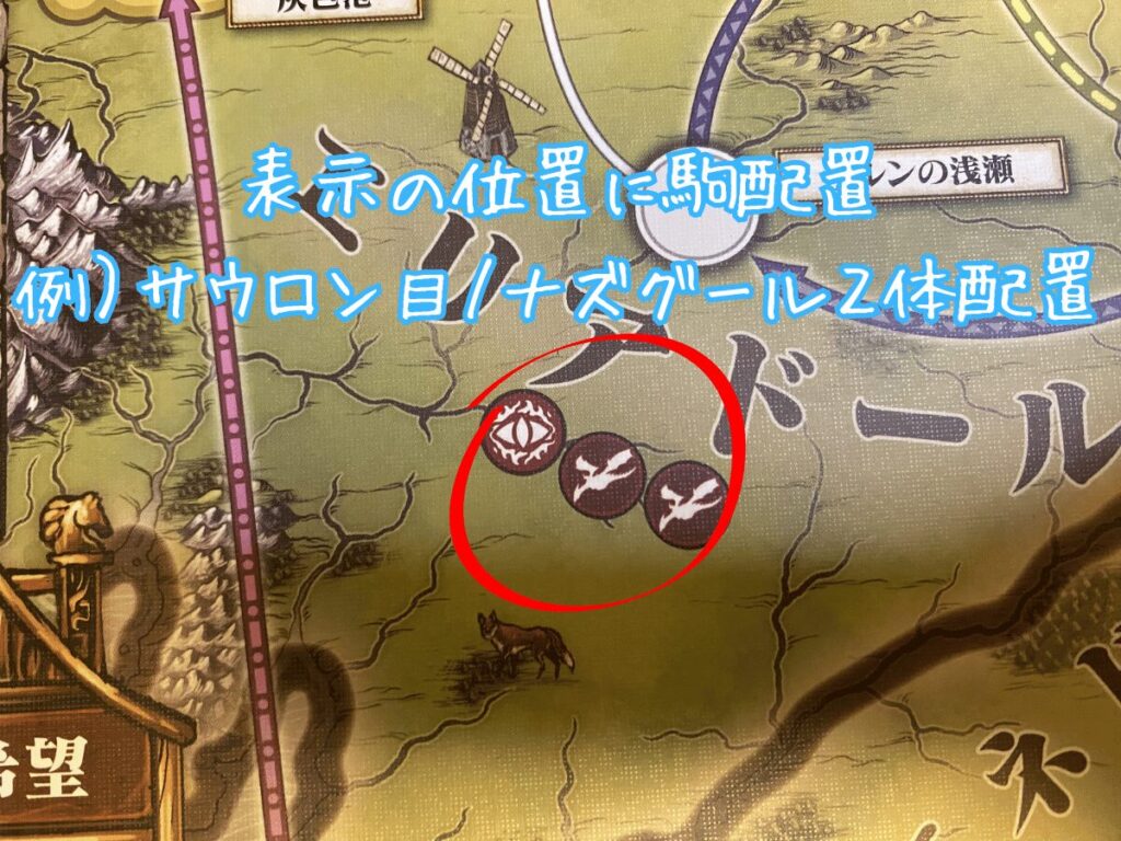 次に「初期部隊駒(敵、味方)」、「ナズグール駒」および「サウロンの目」を所定の位置に配置します。
