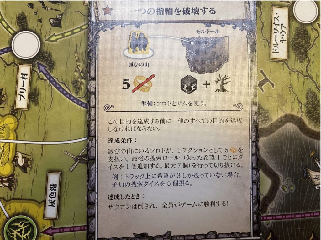 本作は『指輪物語』の世界観を踏襲しているため、サウロンを打倒するための最終目標である「一つの指輪の破壊」に関する目的カードは必ず採用されます。これに加えて、他の目的カードを選択し、ゲームのシナリオを構築していきます。