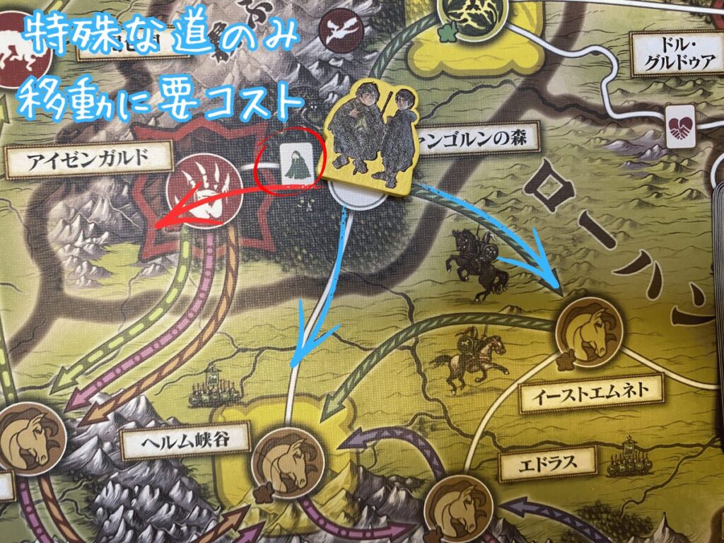 また、フロドが移動する(あるいは同伴する)場合には、移動先の地域に「ナズグール駒」または移動先のスペースに「冥王軍部隊駒」が存在する場合には、その数だけ黒いダイスを振る捜索ロールを行います。1回の移動につき隠密トークン1つを支払うことで捜索ロールを無効化できます。