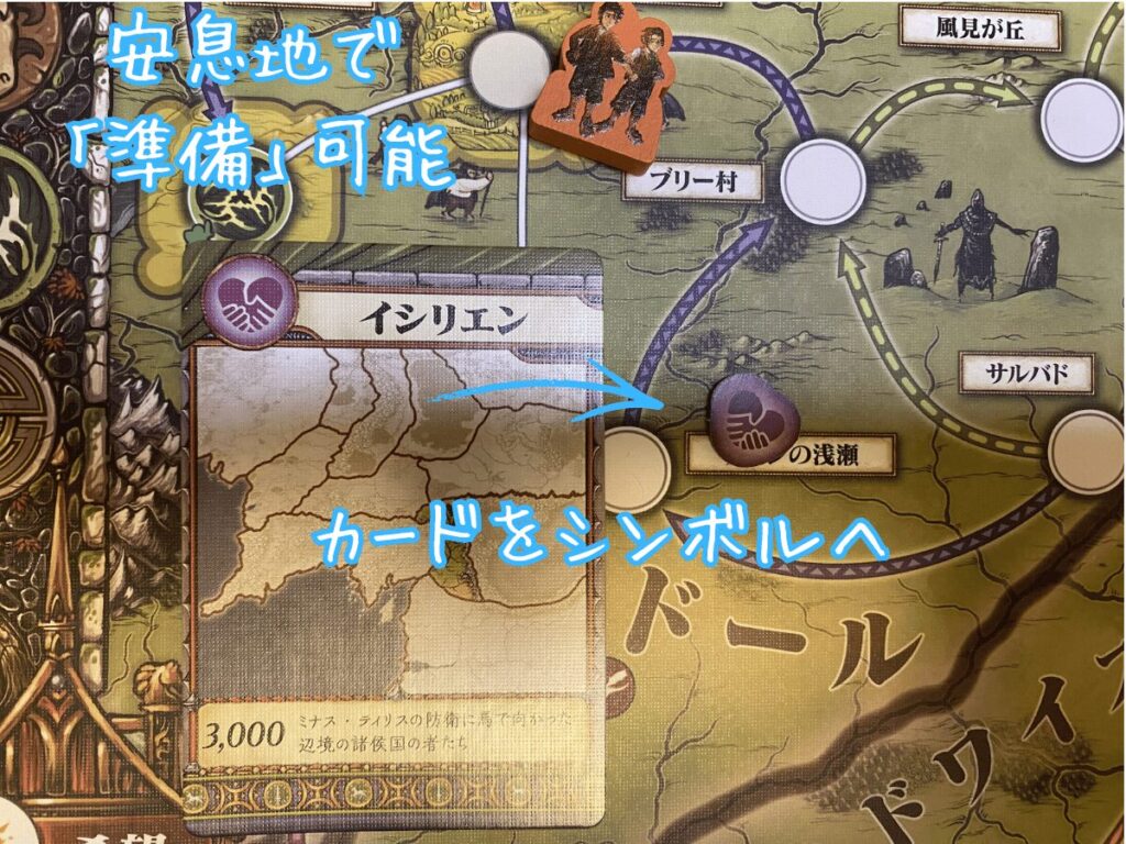 安息地にキャラクターがいるとき、任意の地域カードを1枚捨て札にして、そのカード上に示されているシンボルに対応しているシンボルトークンを1枚得ます。