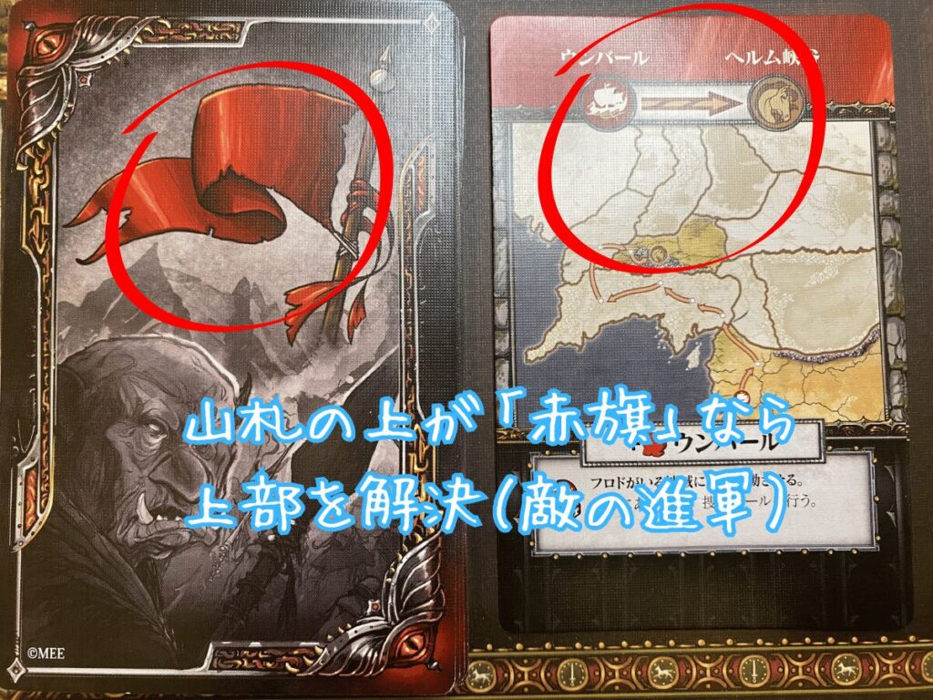 冥王軍デッキの一番上のカードを引き、冥王軍デッキの横に表向きで置きます。デッキの一番上を確認し、赤い旗があれば引いたカードの上段を、黒い旗があれば引いたカードの下段を解決します。