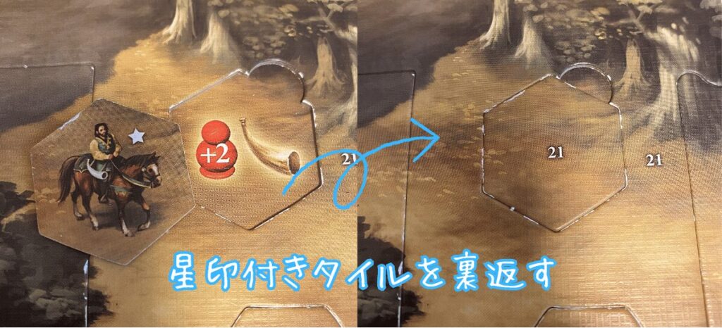 各タイルには無印面(表)と星印面(裏)があり、前回のプレイ状況によっては盤面にはめられたタイルは表裏が混合した状態になっています。そのため、プレイ前には星印面が上になっているタイルを全て表向きの無印面に変えます。