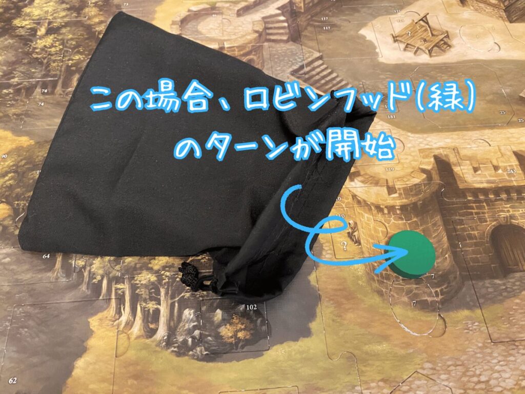 布袋からチップを引くことで、ラウンド中の行動順が決定します。