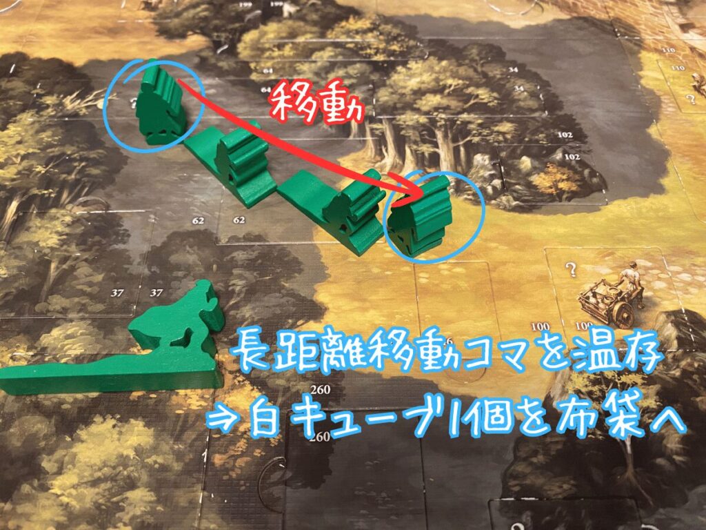 1. 移動にて長距離移動コマを不使用の場合、白キューブを布袋に1個入れる。