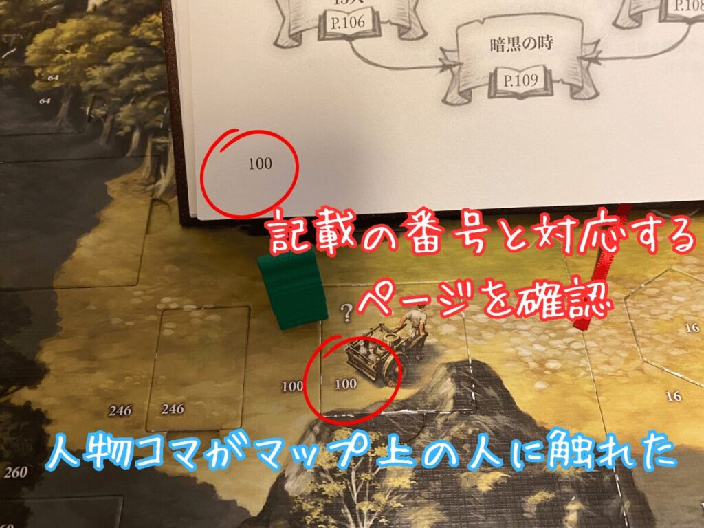 マップ上の数字とストーリーブックのページ数は対応しており、対象のページを参照します。アクションを行ったプレイヤー以外の人が、ページに記載された物語を読み、効果を実行します。