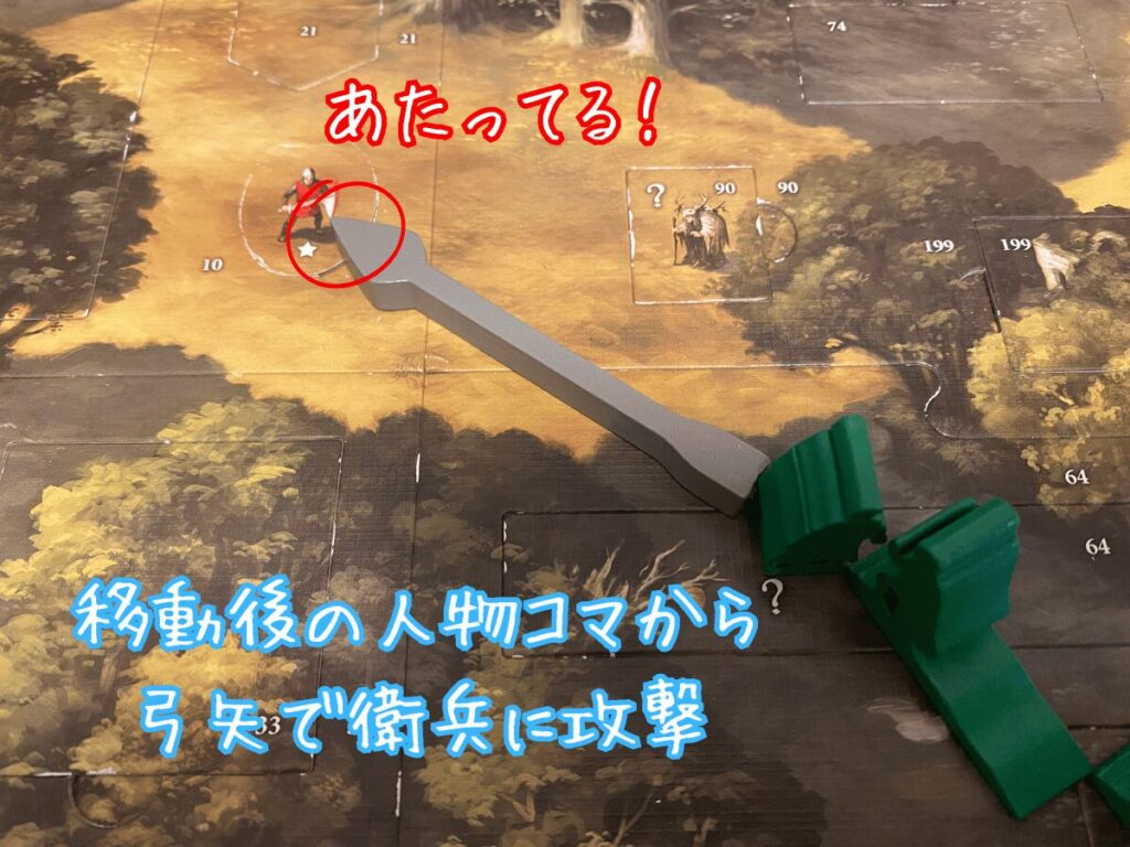 ②弓矢コマを人物コマから延長し、弓矢コマが敵タイルと接触(弓矢保有の場合)