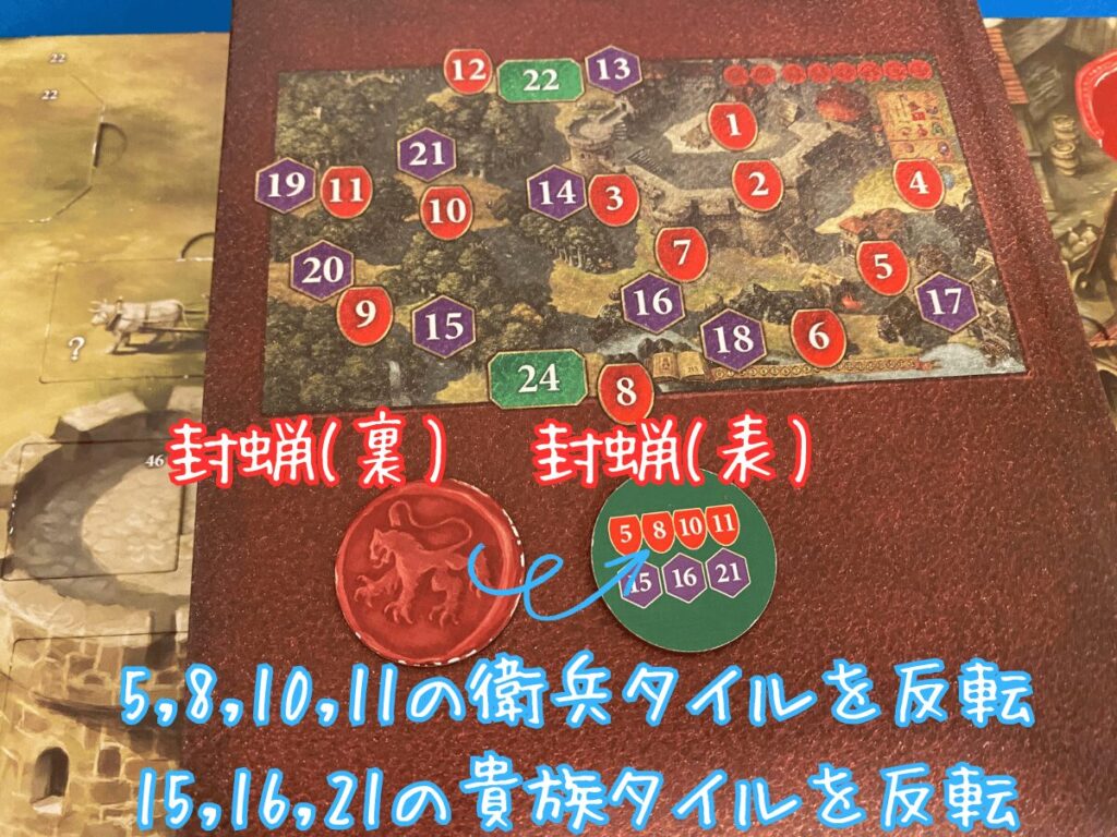 物語によっては、盤面タイルの反転や除去、あるいは封蝋の設置/布袋への投入の操作が記載されています。それに従い、盤面を用意してください。