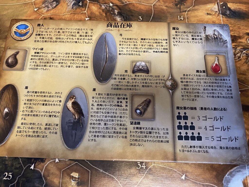 本作品では「戦闘」「商人」「探索」「運搬」的なアクションを取りながら、キャラクターの強化を進め、シナリオの目的をクリアしていくRPG要素のある協力型ボードゲームとなります。特に、「戦闘」によりゴールドを獲得し、「商人」の元に訪れ、ゴールドを対価にキャラクターを強化。この一連のプロセスがRPG好きにはたまりません。
