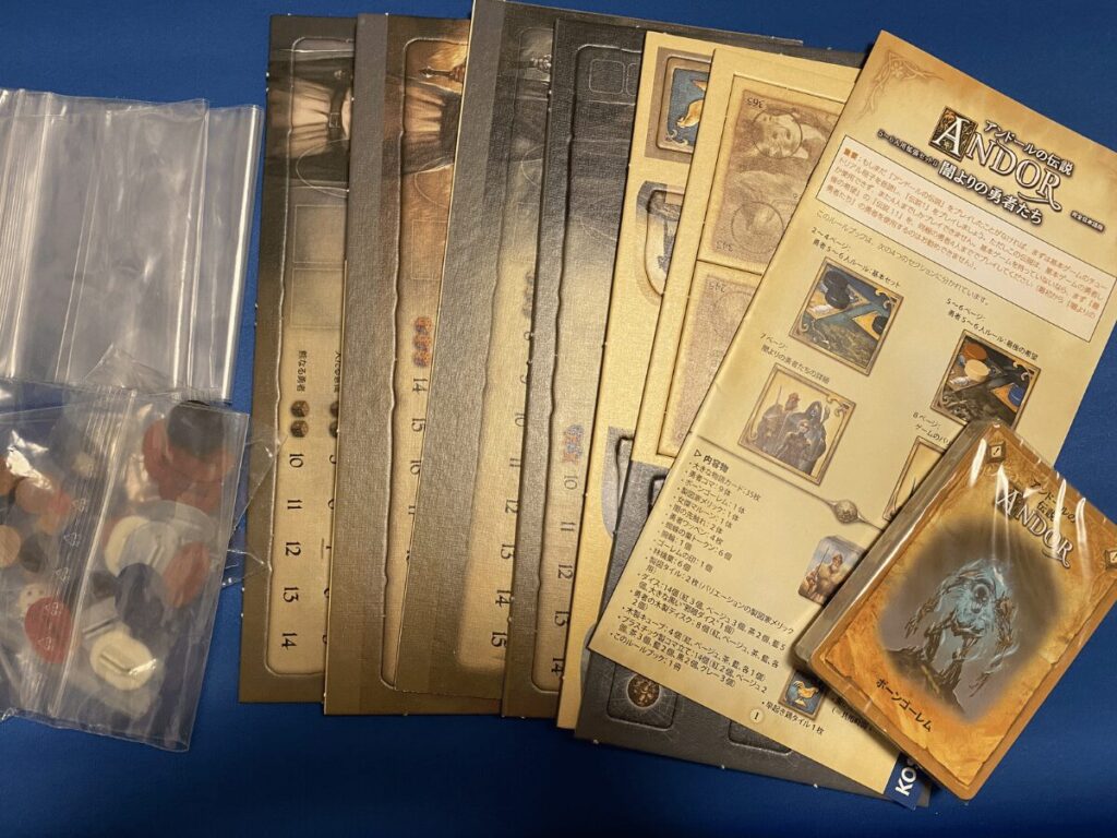 本作は基本セット→北方への旅立ちに続くメインの拡張セットとなります。アンドールの伝説の最後までを描く第3章目となります。伝説7つを収録する大ボリュームで、コンポーネント量としては最大となります。