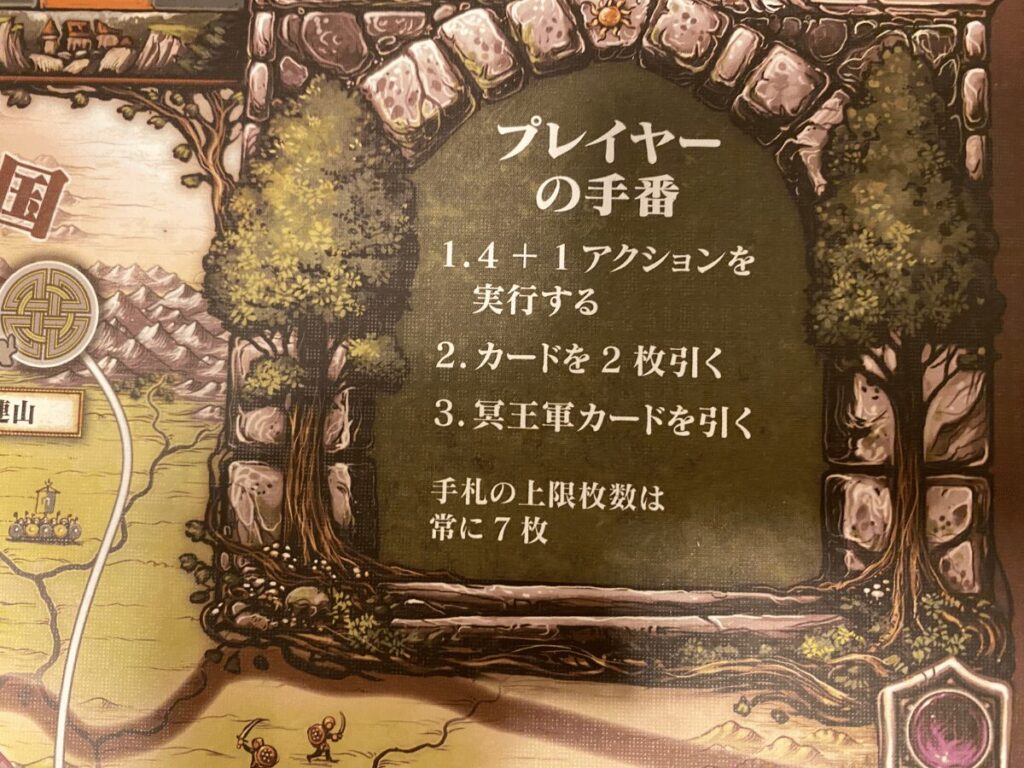 指輪物語の設定はあくまで“世界観”として機能しているため、原作を知っていれば地名やキャラクター、演出にニヤリとできる場面が多く、没入感が一層高まります。一方で、原作知識がなくてもゲームとしての完成度は非常に高く、純粋に協力型ボードゲームとして十分に楽しめる設計になっていましたね。