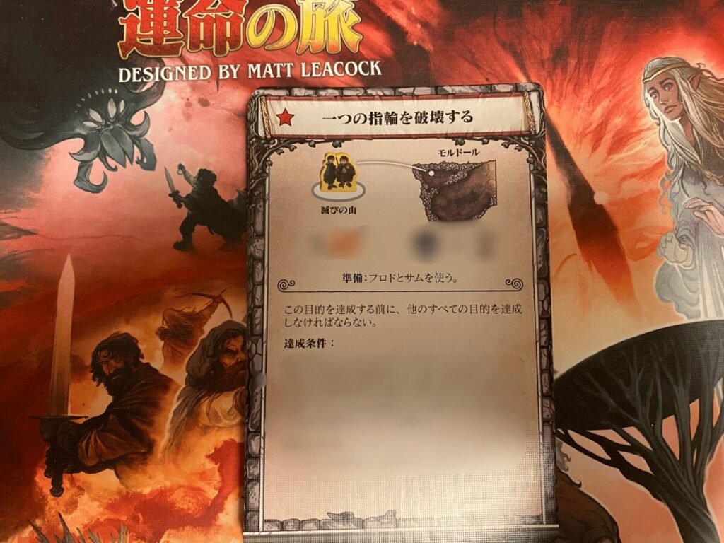 難易度ごとに使用する目的カードの枚数が定められており、指輪の破壊以外にも複数枚の目的カードを選択してプレイすることになります。なお、最終目標である指輪の破壊は、他の目的カードをすべて達成してからでなければ実行できません。