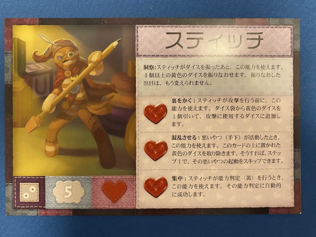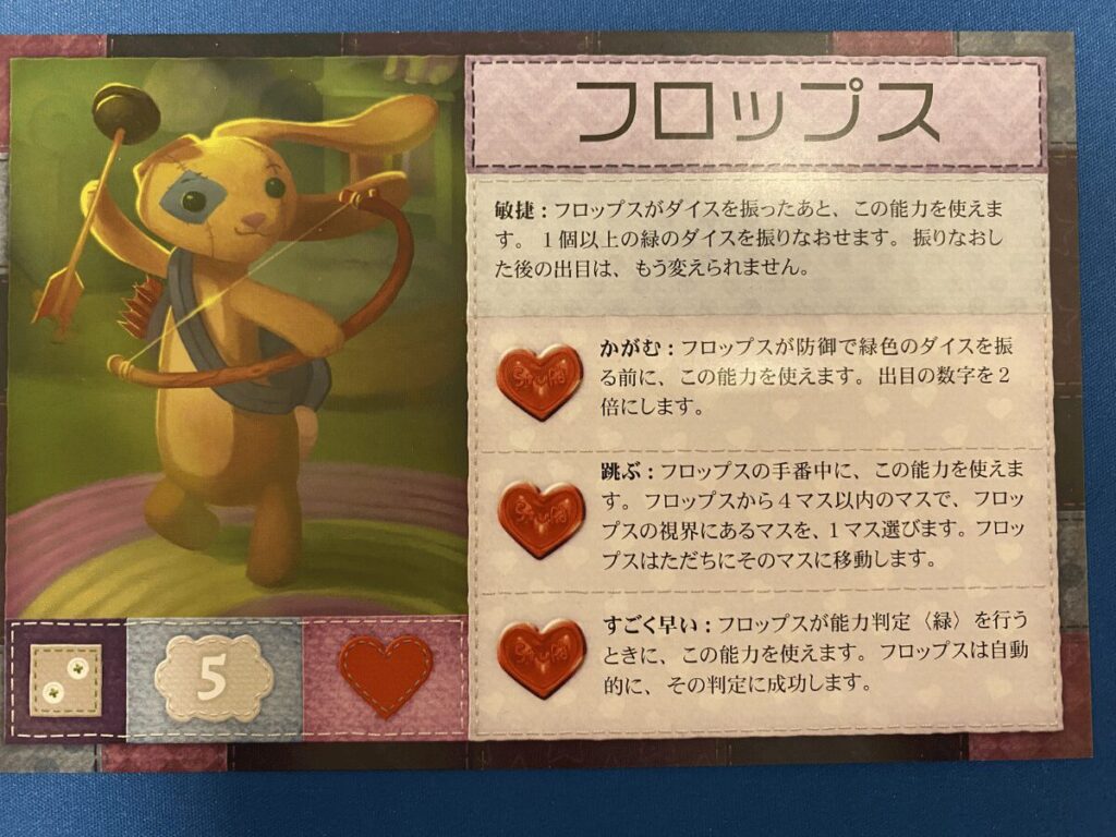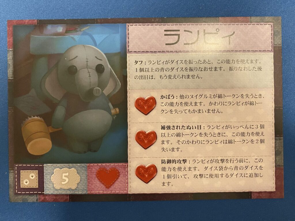ランピィの基本能力は青ダイスの振り直しです。青ダイスは主に移動アクションに使用されるダイスですが、移動自体は他のダイスでも行えるため、本作の中では比較的重要度が低いダイスでもあります。そのため、この能力が活きる場面は防御時が中心となり、全体としての汎用性はやや低めでしたね。