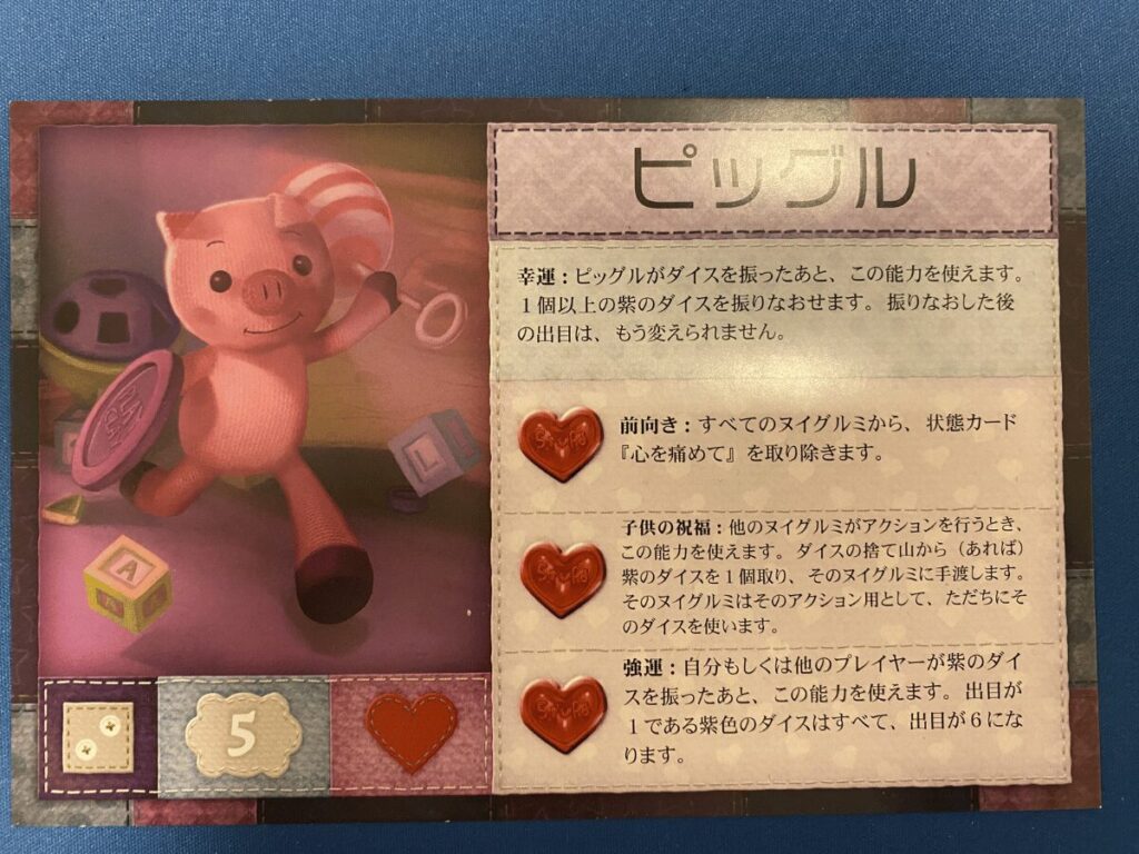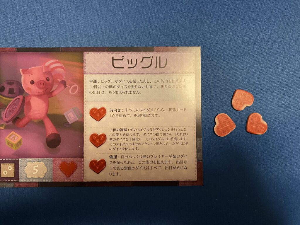 また、ピッグルの特殊能力は「状態回復」「捨て山から紫ダイス提供」「紫ダイスの出目変更」の3つです。状態回復の能力は特に有用で、「心を痛めて」状態は住民カードやイベントで発生することが比較的多く、さらに状態異常によるデバフはこのゲームではかなり重いものが多いため、即座に回復できる能力は非常にありがたい存在です。