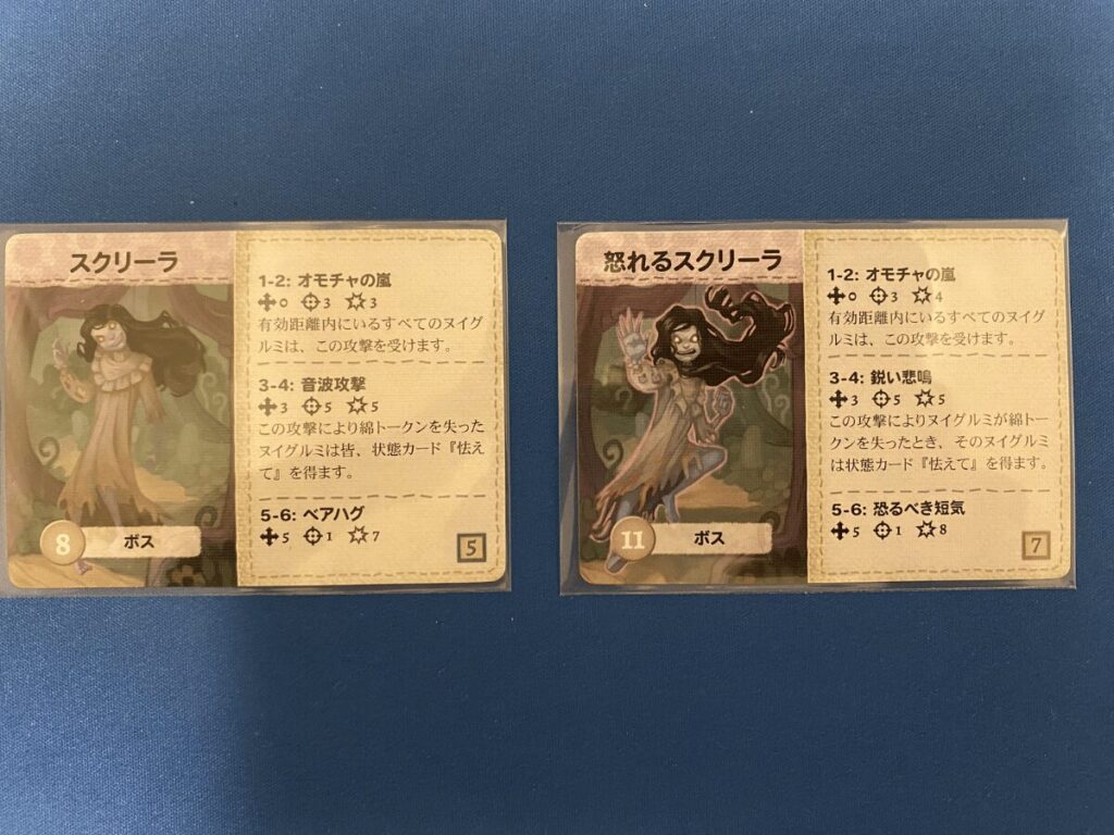 そしてついに対峙する「怒れるスクリーラ」は、通常のスクリーラよりも攻撃面が強化されており、最大ダメージはなんと8。防御ダイスで最高値の6を出しても完全には防ぎきれず、防御ダイスを失ったうえで綿トークンを2つ失うほどの威力です。そのため、はあとトークンの確保や特殊能力による防御、あるいはアイテムカードによる強化が重要になります。ただし、必要なアイテムを引けるかどうかは運次第。防御に失敗すれば一瞬で形勢が崩れる、非常にシビアな戦いでした。