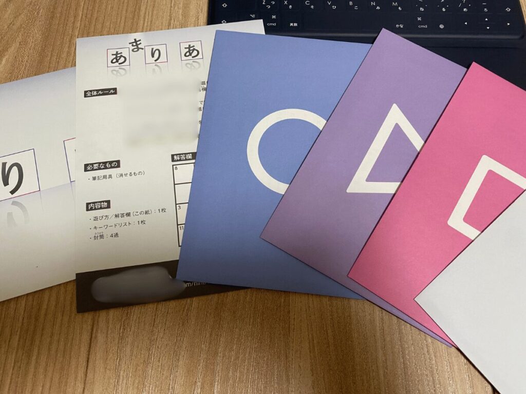 封筒を開封すると、嫌な予感は的中しました。今回の謎解きは物語無しの“ワードパズル系”謎解き。個人的にパズル系、ワードパズル系の謎解きは苦手ジャンルに感じているんですよね。パズル系の謎解きは少し作業感があるのと、謎解きはある程度パターンによる攻略が出来るのに対し、ワードパズルは言葉が思いつかないと次は進めないわけです。つまり、サクッと突破できるほどの語彙力が無いんです(泣)。