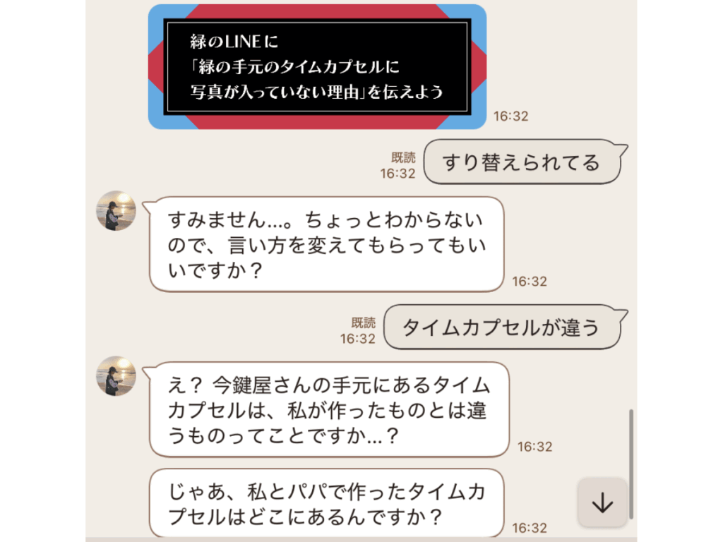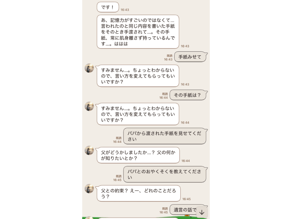父のブログから「おやくそく」を使うことまでは分かるものの、LINEで問いかけても返ってくるのは意味深で要領を得ない“遺言”ばかり。これは何か見落としているはずだ、と依頼人が父から受け取ったという手紙、「ここにヒントがあるんじゃないか?」と永遠にみどりさんに尋ね続けてました…結局、そこには直接的な答えはありませんでした(笑)。