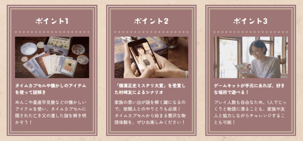 単純に小謎を解いて、その答えを利用して大謎を解く…というのが量産型の謎解き作品です。優れた謎解きキットになると、謎解きの仕掛けが徐々に豪華になっていきます。例えば、物語に絡めて解く、用紙に工作を加えて解く、専用ページを用意する…などなどです。本作ではタイムカプセルに眠った数々の懐かしい小道具を利用した謎解きになっている他、専用ページの利用、時事的要素の利用、LINEの利用など本当に様々な要素を加えた謎解き作品で非常に面白かったです。