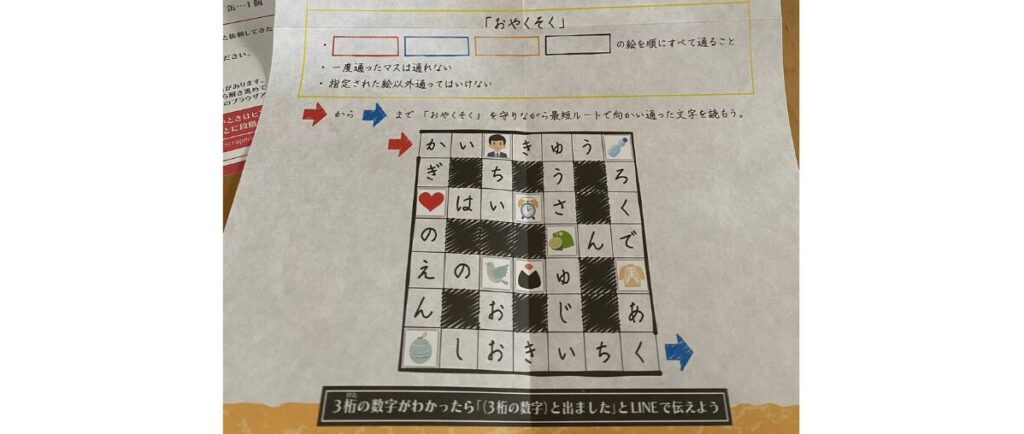 全体として、シンプルな謎解きがほぼなく、基本的に何かと掛け合わせた謎解きであるため1つ1つの質が高く楽しめました。また様々な仕掛けを用意している他、LINEや専用サイトの利用など一手間掛かっており、シンプルに楽しいです。初心者さんは謎解きに興味ある複数人を巻き込んで是非プレイしてみてほしいですね。きっと謎解きにハマると思いますよ!