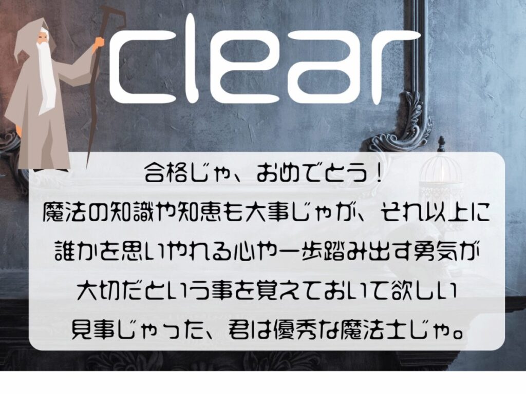 まるでダンブルドアを思わせる人物からの出題があります。ただ、アイテム一覧に求められている物が見当たらないため、ここで少しだけ視点を切り替える必要があります。とはいえ、小謎シートに残された意味深な未使用要素に気付けば、解法は比較的素直。最終問題もスムーズにクリアできました。